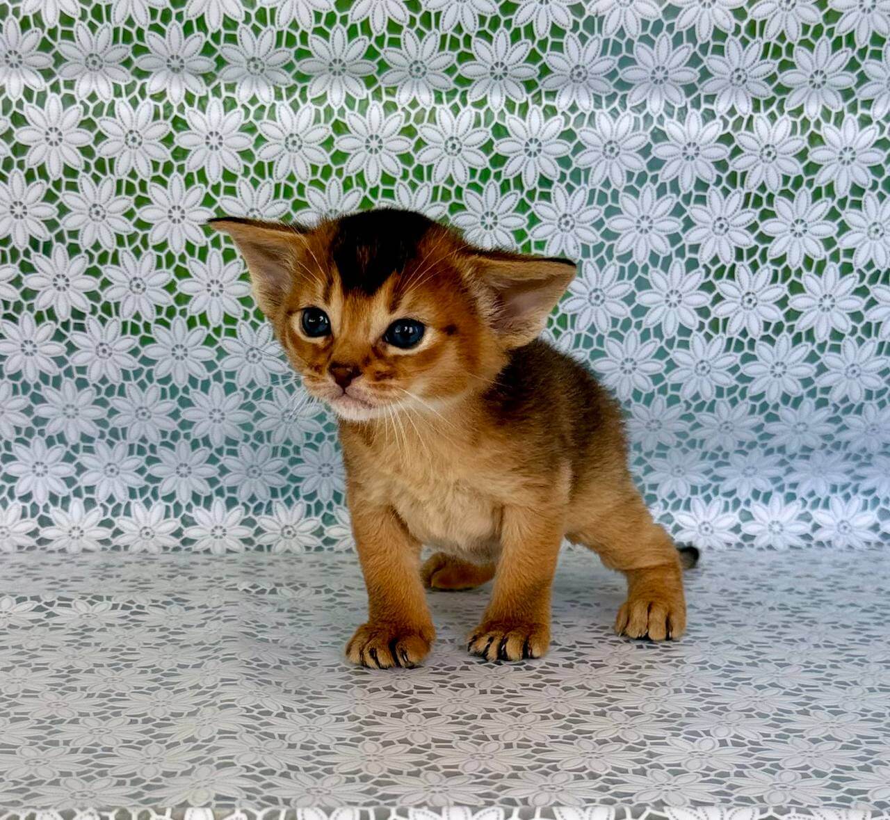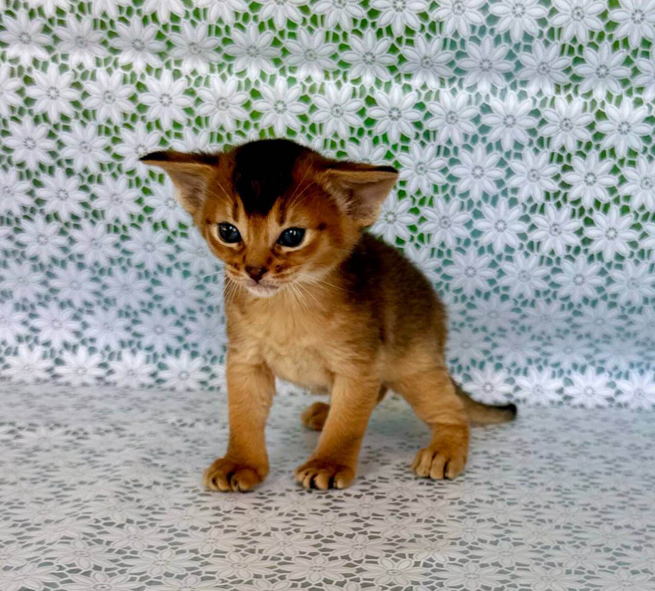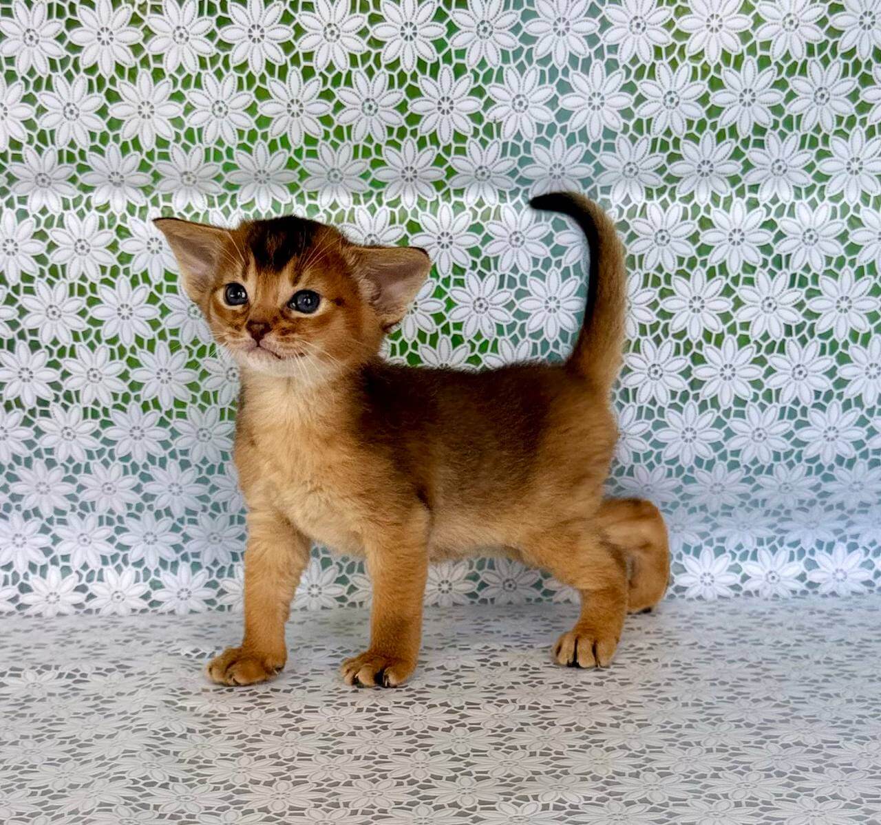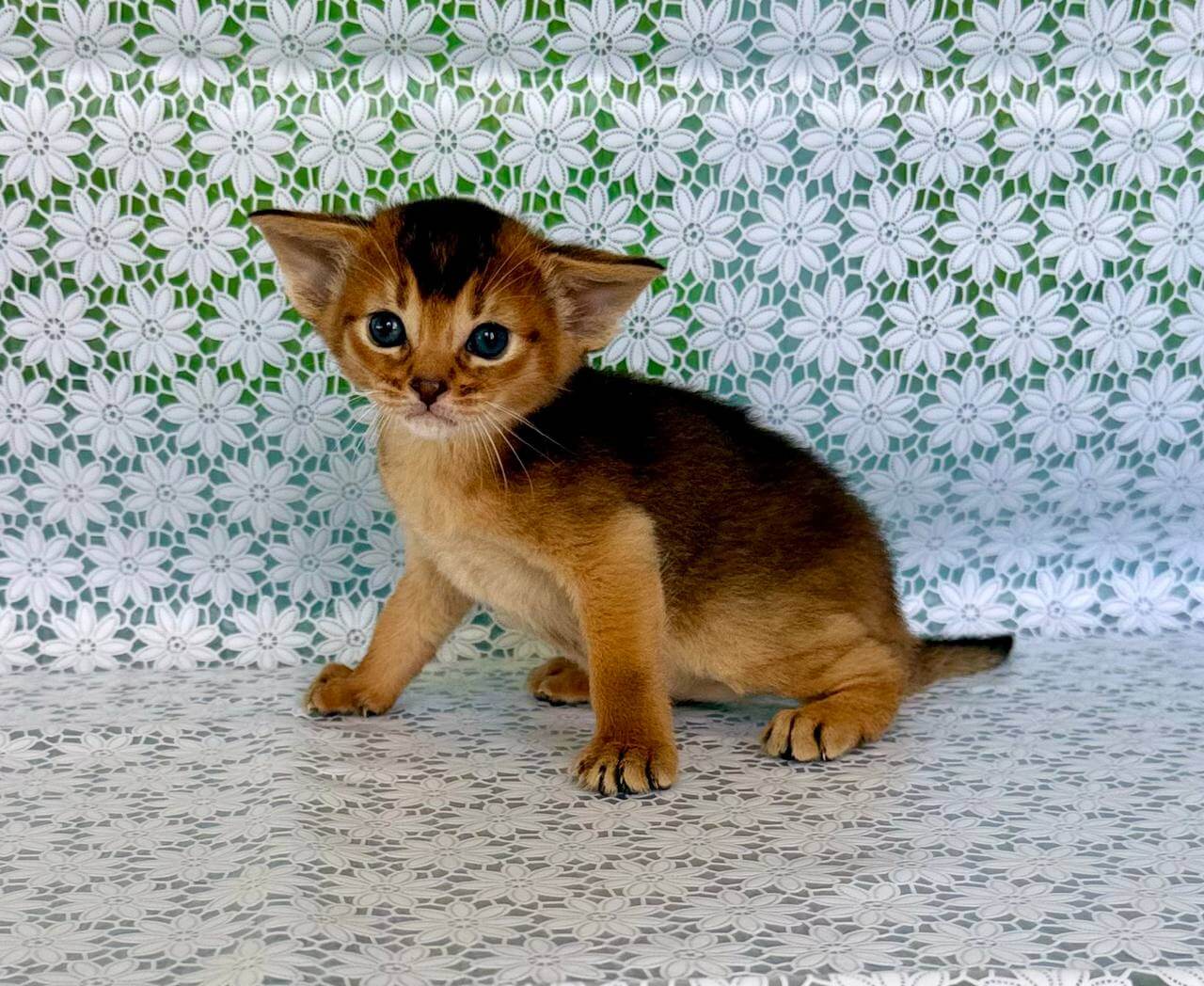 Run your fingers along Zholi’s ruddy Abyssinian kitten coat, and you’ll notice each hair feels springy and warm—almost tickling your skin. Her yellow eyes spark curiosity, pooling light and gold when she fixes her gaze on you. Zholi settles in your lap as if she already belongs there, her presence steady and velvet-soft, ready to soak up every gentle pat.