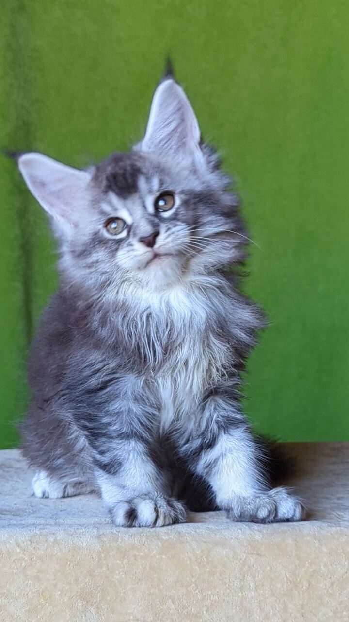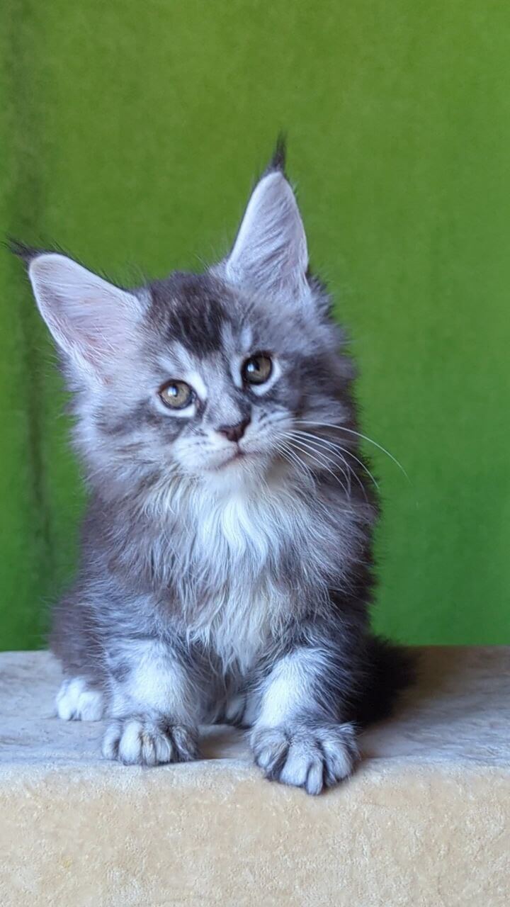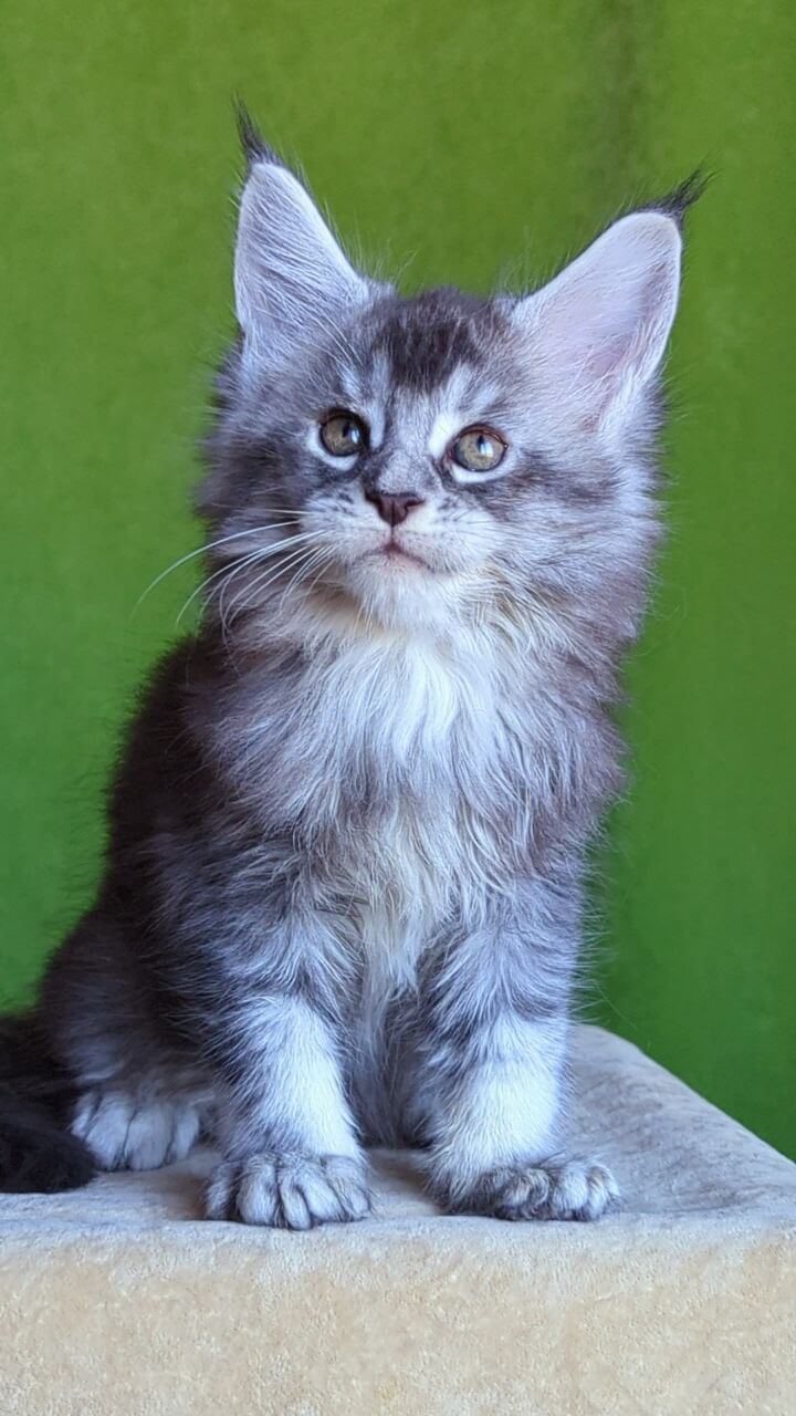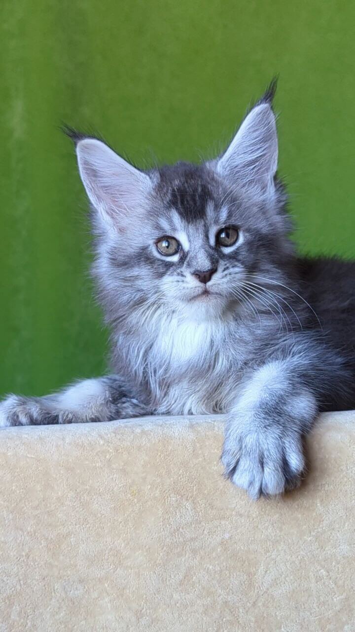 Meet Zvezdachet – a breathtaking Maine Coon boy destined to melt your heart. Instantly, you’ll be captivated by his silken black-silver tabby coat and bright, soulful yellow eyes that shine with gentle curiosity.